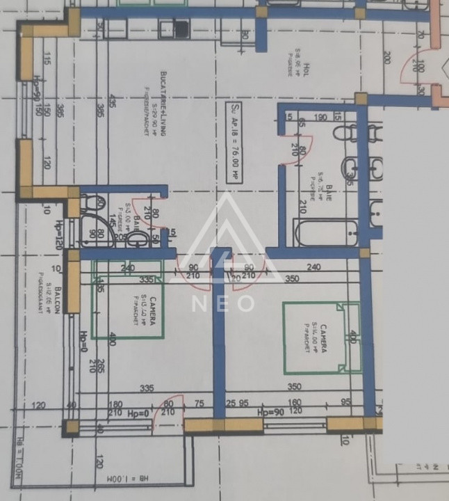 Apartamentul dispune de o suprafata utila de 76 mp + 12 mp terasa si este compartimentat astfel: 2 dormitoare, 1 bucatarie cu livingul open space, 2 bai si terasă.